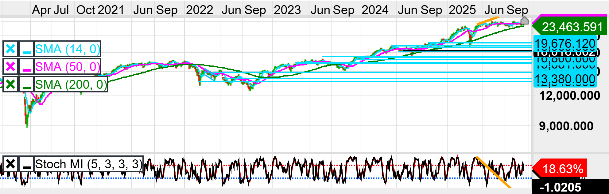 The daily chart maintains a broader bullish structure, with price holding near 23,463, still above the rising 50-day and 200-day moving averages, which confirms the long-term uptrend remains intact. However, the slope of the 14- and 50-day SMAs has begun to flatten, showing that upside momentum is slowing after the extended May–July advance. Importantly, price has made higher highs into June–July, while the Stochastic Momentum Index has formed a clear series of lower highs, producing a well-defined bearish momentum divergence. This indicates internal exhaustion despite price stability near the highs. Immediate resistance sits around 24,500, where several recent peaks cluster, before a more psychological ceiling near 25,000. On the downside, near-term support is around 23,000, which corresponds to the most recent swing low and the top of the prior consolidation shelf. If selling accelerates, the next major structural support lies at 19,676, aligning closely with the major horizontal level drawn on your chart. Given the divergence and slowing trend strength, traders should treat rallies into 24,500 as vulnerable to rejection, with protective stops placed under 23,000 if holding longs.