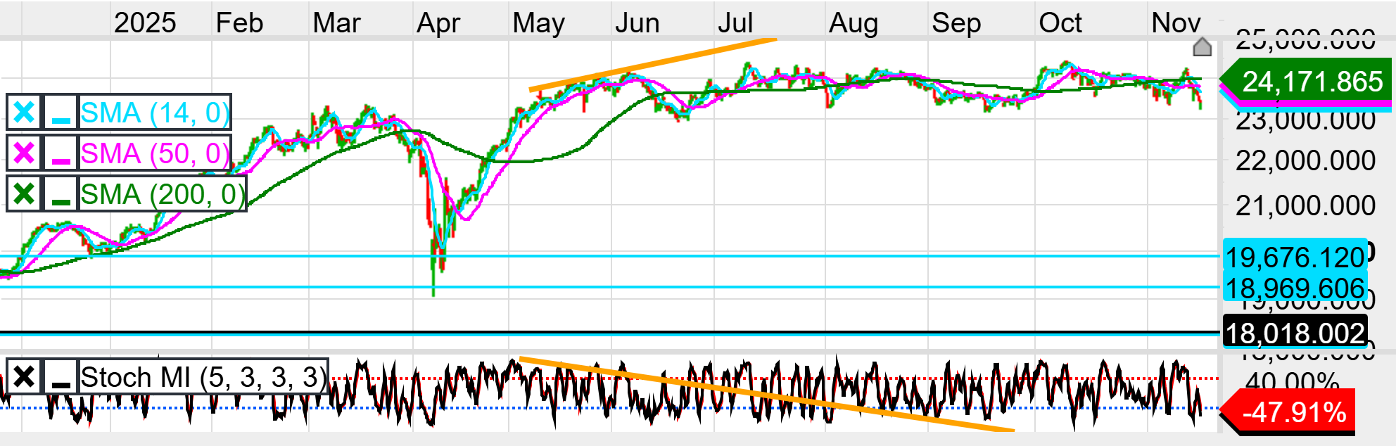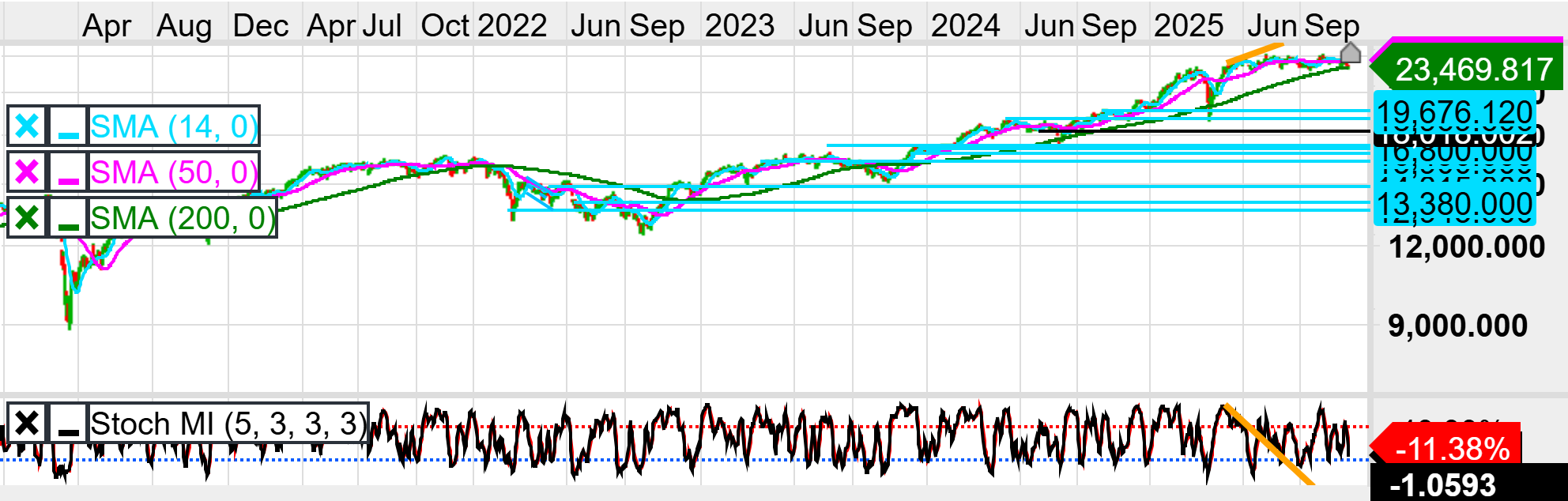 The daily chart shows that the DAX remains in a broad uptrend, with price holding near 23,469, but the structure has shifted from clean bullish momentum to neutral with clear deterioration. Price is still above the 50-day and 14-day SMAs, but both have begun to flatten, while the 200-day SMA near the 23,469 area continues rising — still supportive but no longer accelerating. Price has formed a series of marginal higher highs between June and September 2025, yet the Stochastic Momentum Index has printed sharply lower highs, forming a strong multi-month bearish divergence, signalling weakening upside pressure despite price grinding upward. Immediate resistance remains at 24,500, the area repeatedly rejected during August–September, with a broader extension to 25,000 if momentum reignites. On the downside, initial structural support is the round 23,000 region, but the next major pivot sits at 19,676, which is also the upper boundary of the previous consolidation zone and has been marked clearly on your chart. The daily trend remains technically upward, but the divergence and flattening SMAs imply a maturing rally. A close below 23,000 would confirm momentum rollover and open a deeper move toward 19,676, while a protective stop for long positions sits just below 23,000 to avoid a trend failure.