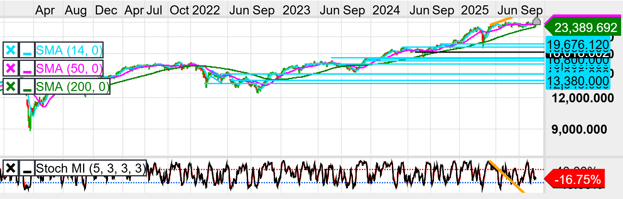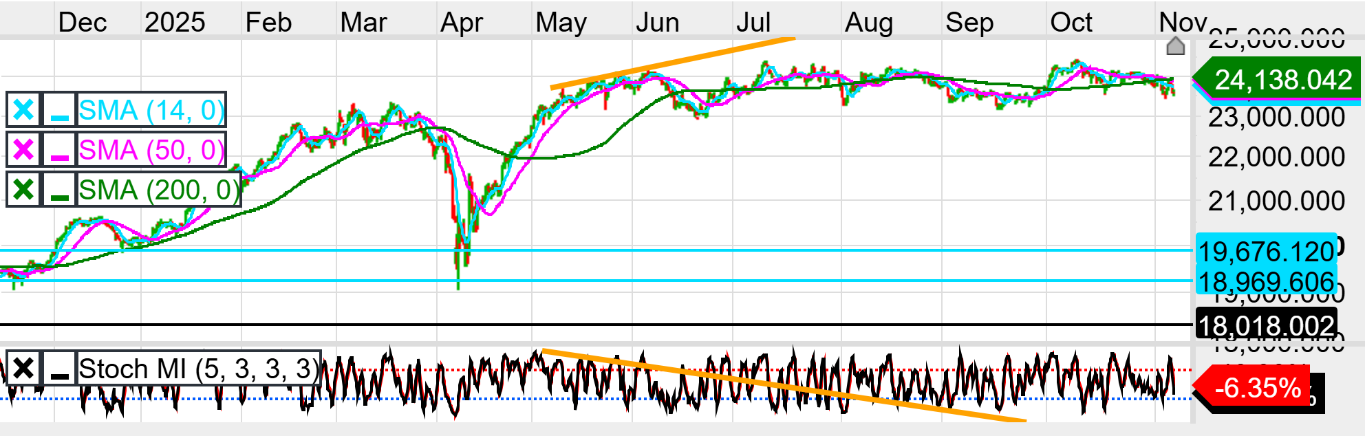 On the daily timeframe the market is still sitting at multi-year highs (price 24,100–24,200) but the internals show clear deterioration — price has made a marginal new high while the Stochastic Momentum Index has been tracing lower highs (highlighted on the chart), a textbook negative divergence that warns the upside impulse is losing conviction. The 200-day SMA (green, 23,389) sits just beneath price and remains the most important structural line: a clean daily close below that 200-SMA would shift the longer-term bias back toward bearish. The shorter SMAs (14 and 50) are tightly bunched and beginning to flatten, which signals range/consolidation risk rather than a strong trending advance; that compression increases the chance of a corrective leg. Tactical levels: a sustained break and close above 24,300 would revalidate upside (next extension target 24,800), while failure to hold the 200-day SMA exposes a deeper retracement toward the larger support shelf near 19,676 (the blue horizontal support cluster on the chart). Trading plan: avoid sizey new long commitments while divergence persists — for longs require a reclaim of 24,300 with stop under the 50-day SMA or intraday swing low; for those preferring to trade the warning, consider tight mean-reversion shorts into rallies with stops above 24,800 and targets initially toward the 200-day SMA (protective stop for shorts 24,900).