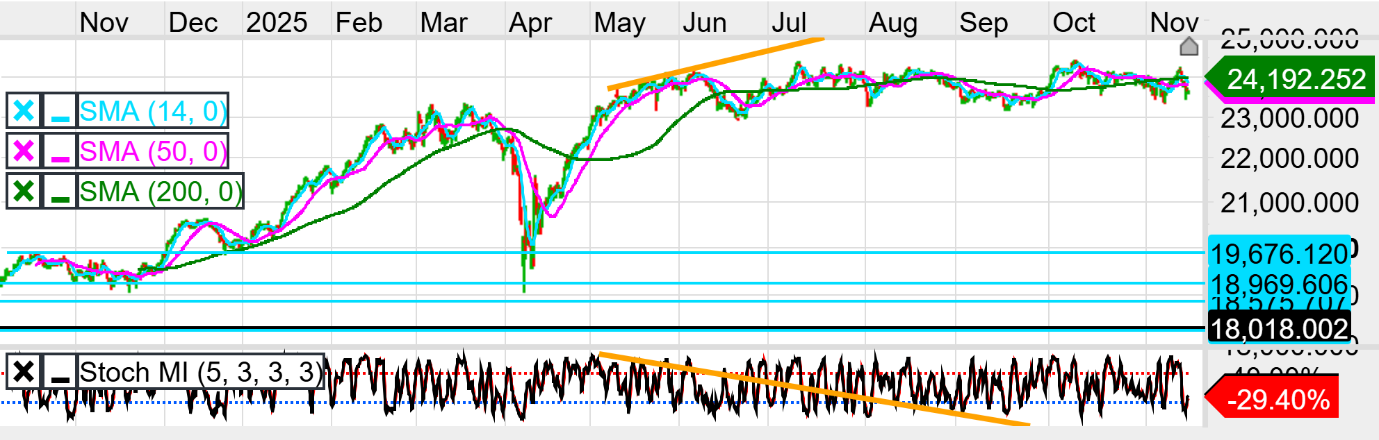 The 4-hour chart reflects a clear loss of momentum, with price consolidating around 24,192 while the 14- and 50-period moving averages drift sideways and the 200-period SMA begins to flatten. Price continues to register higher short-term highs, but the SMI is plunging sharply into –29.40%, creating a pronounced bearish divergence that confirms weakening buying pressure beneath the surface. Immediate resistance lies near 24,300, where recent intraday highs intersect, followed by 24,700, the upper boundary of the summer range. Support is first seen at 23,800, the most recent pullback low, with a deeper level at 23,000, which aligns with both a major swing low and one of the key horizontal levels shown in your chart. The short-term momentum profile clearly favours a pullback, and traders may look to fade strength into 24,300–24,700 with stops above 24,750. Any break below 23,800 increases the probability of a corrective push toward 23,000, where stronger buyers are likely to re-engage.