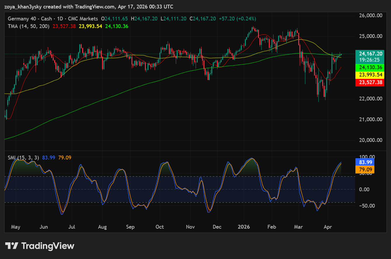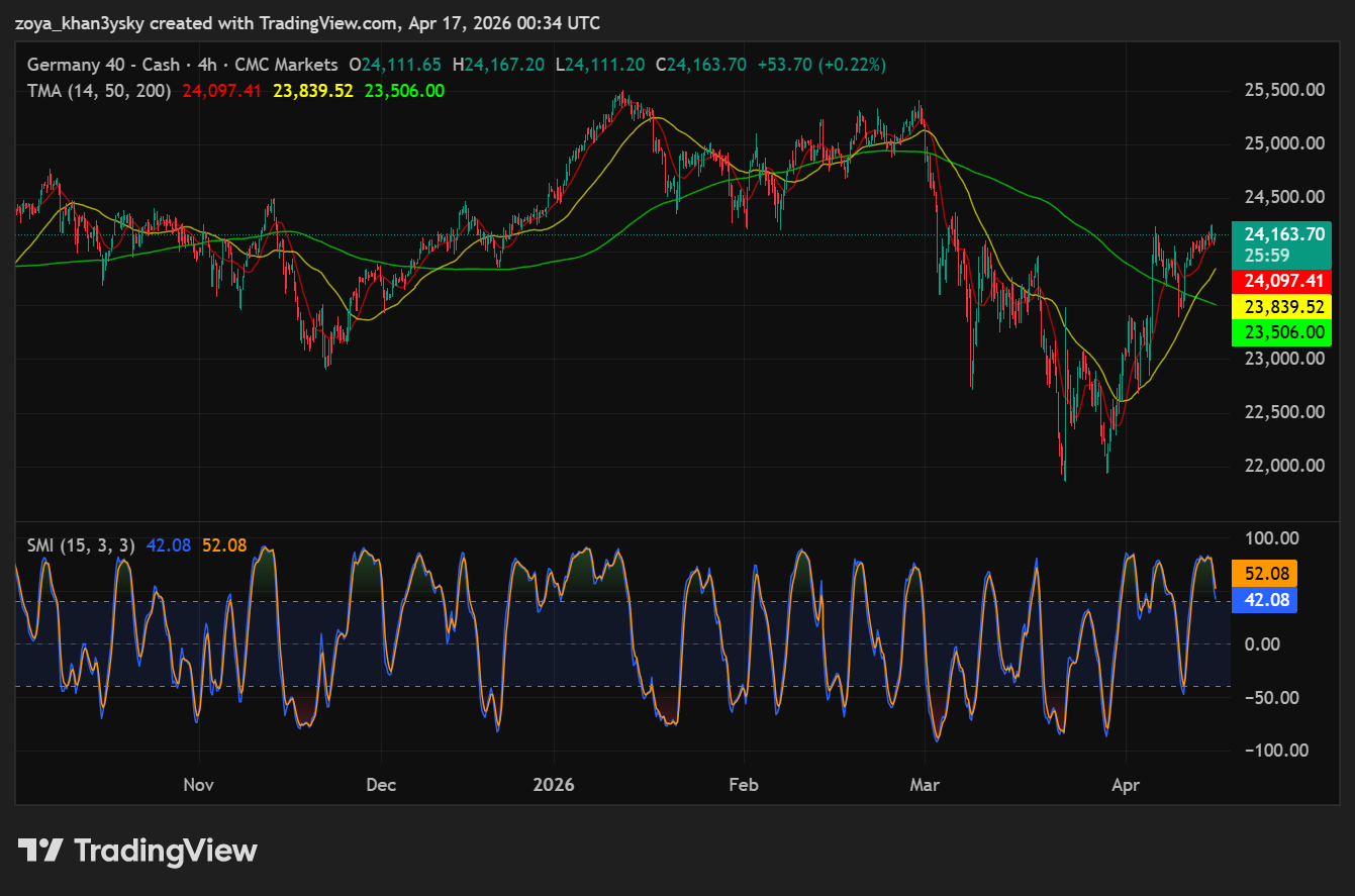 On the 4-hour chart, Germany 40 has already shifted into a bullish short-term structure, with price at 24,080 trading above the 14-period moving average at 23,845, above the 50-period moving average at 23,601, and above the 200-period moving average at 23,569, which shows buyers have regained control across all key trend layers. The recent rally from the April lows has been decisive, and the fact that the faster moving averages are now above the slower ones supports the idea of a developing bullish trend rather than just a dead-cat bounce. The Stochastic Momentum Index at 82.42/75.49 is in overbought territory, reflecting strong upside momentum, but because price has already extended sharply over a short period, this also raises the risk of a near-term pause or shallow pullback before the next leg higher. Momentum is still confirming price rather than diverging from it, so there is no firm bearish divergence signal yet, but with SMI this elevated, traders should expect resistance to matter more. The next upside objective is around 24,300, which is the next visible reaction zone, followed by 24,500, where prior supply is likely to re-emerge. On the downside, initial support is the 14-period average at 23,845, and below that the 50-period average at 23,601 is the more important structural support, because a fall through that area would suggest the current rebound is fading and likely rotate the market back into consolidation. The preferred strategy is to stay tactically bullish while price remains above 23,845, either buying controlled pullbacks into support or a firm break through 24,300, with a stop loss below 23,601 to guard against a failed breakout.