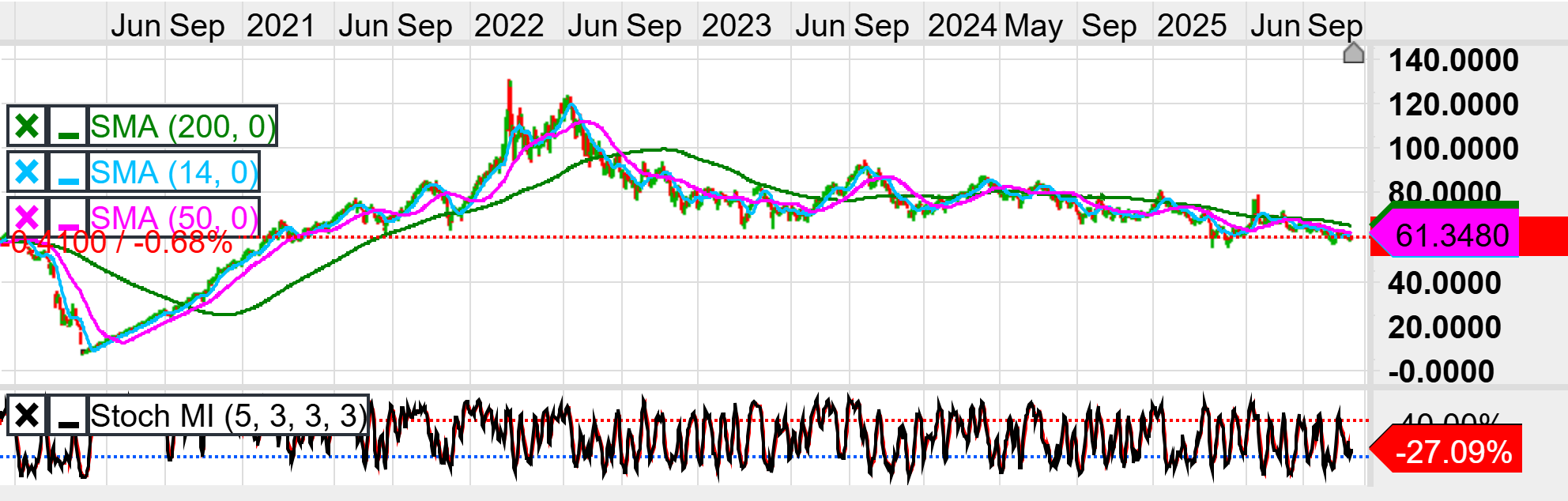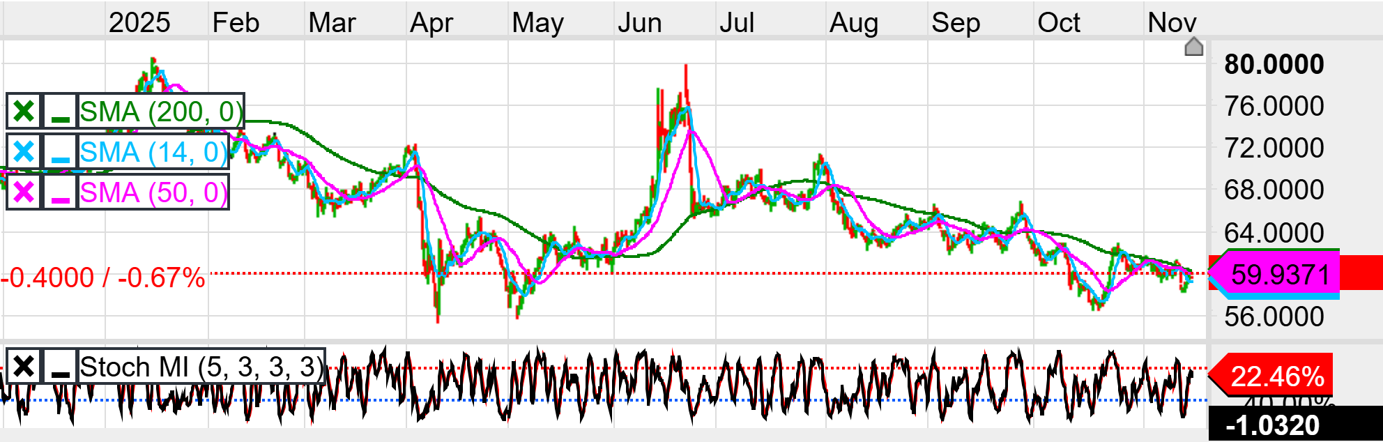 The 4-hour chart shows a more balanced but still fragile picture, with price oscillating just under 60 and below all three key moving averages, as the 200-period SMA (green) trends lower from the low-60s and the 14- and 50-period averages (blue and pink) are flattening slightly overhead; this configuration indicates that the short-term trend is still under pressure, but recent selling has begun to lose momentum. The Stochastic Momentum Index has turned up into positive territory around 22.46% after registering deeper negative readings on prior lows, while price has held roughly in the same 59–60 band, forming a positive momentum divergence that often precedes corrective rallies within a broader downtrend. Initial resistance is therefore defined around 61, where the faster moving averages intersect with recent intraday swing highs, with a secondary cap near 63 close to the declining 200-period average and a prior breakdown area. On the downside, immediate support sits near 59, the recent reaction low, with a more important level toward 57, which corresponds to the June/October congestion zone and would mark a fresh short-term breakdown if breached. Short-term traders may look to fade strength into the 61–63 region in line with the broader daily downtrend, using stops above 63, targeting a return to 59 and then 57; more tactical dip-buyers trying to play the SMI divergence should only consider longs on clear holds above 59 with tight stops under 57, aiming for a corrective move back toward 61–63 where stronger resistance is expected.