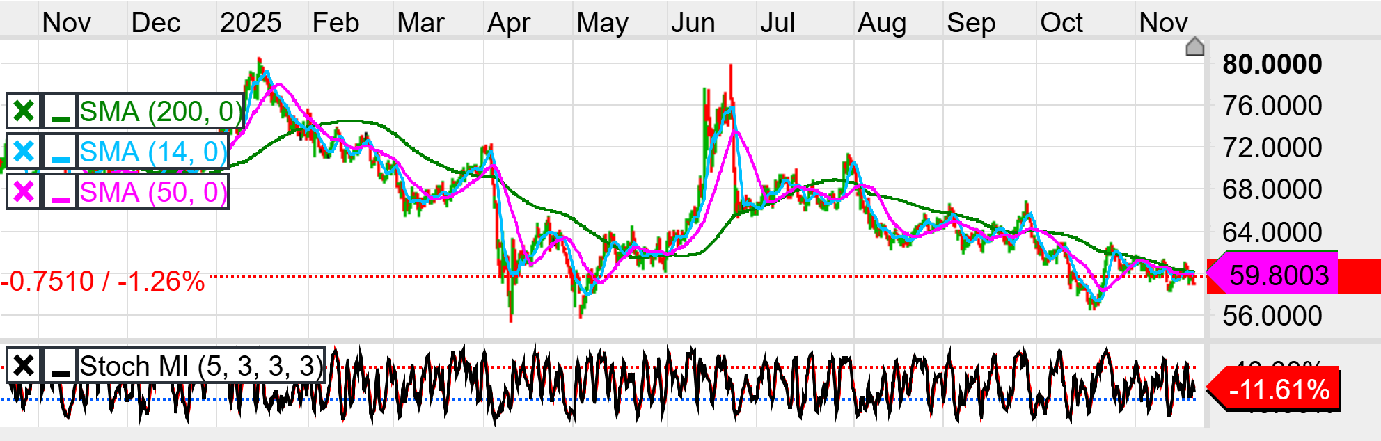 The 4-hour chart reinforces a bearish short-term outlook, with price currently at 59.80 and trading firmly below all three short-term SMAs, which have now turned downward, signalling renewed downward momentum. The 200-period SMA (green) is rolling over after acting as resistance throughout October, showing sellers regained control after the failed rallies near 65–67 during mid-year. Price recently attempted a minor bounce but failed to reclaim the declining 14- and 50-period SMAs, creating a fresh lower-high structure. Meanwhile, the SMI at −11.61% shows momentum firmly in bearish territory, with no bullish divergence present—momentum confirms price direction. A breakdown below 58.90 would open a path toward 57.20, a key support aligned with multiple prior pivot lows. Upside resistance sits at 61.80, the level where rallies have been repeatedly rejected, with stronger resistance at 63.20. For traders positioning short, a tactical stop loss belongs above 61.80, as any sustained move above this threshold would break the short-term bearish structure and signal the start of a consolidation phase instead of further downside continuation.
